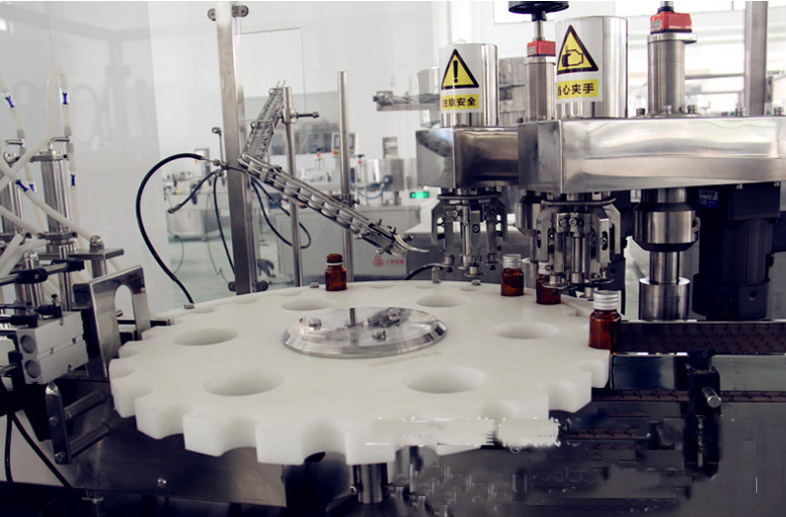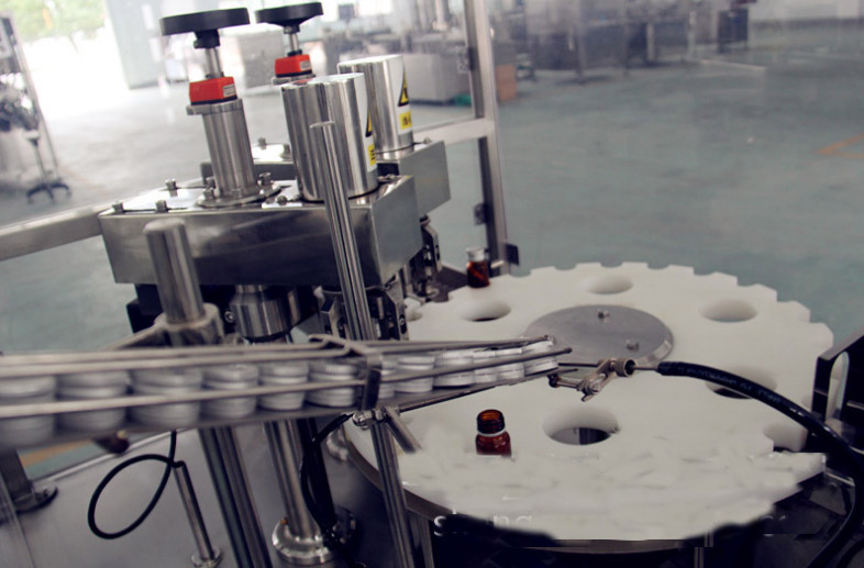 該西林瓶灌裝壓塞鎖蓋機(jī)集自動進(jìn)瓶、理蓋、上蓋、抽吸真空、旋蓋、出瓶于一體,生產(chǎn)效率高,運(yùn)行穩(wěn)定可靠;西林瓶灌裝壓塞鎖蓋機(jī)的真空度可按需要設(shè)定,使用旋合式旋蓋原理和全密封真空式結(jié)構(gòu);該西林瓶灌裝壓塞鎖蓋機(jī)自動化程度高,設(shè)計合理,主要是由瓶子輸送、理蓋、夾瓶掛蓋、旋蓋、電控等機(jī)構(gòu)和抽真空系統(tǒng)組成;此西林瓶灌裝壓塞鎖蓋機(jī)能耗低、適應(yīng)性好,旋蓋機(jī)構(gòu)高度可調(diào)節(jié),適應(yīng)相同口徑、不同高度的瓶子旋蓋;更換部分零件即可實(shí)現(xiàn)不同瓶徑、不同口徑的旋蓋,更換快捷方便;夾瓶子的托爪帶有膠墊,真空罩、旋蓋、配蓋機(jī)構(gòu)都是氣缸驅(qū)動,在使用過程中都能做出精確調(diào)整,動作靈活;送蓋機(jī)構(gòu)有光電感應(yīng)安全保護(hù)裝置,可實(shí)現(xiàn)無蓋開機(jī)送蓋,蓋滿關(guān)機(jī)不送蓋;