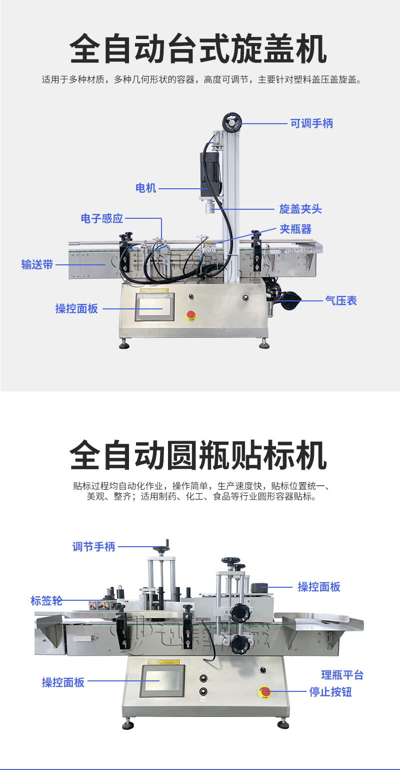 本設(shè)備主要適用于食品、日?;?、農(nóng)藥、醫(yī)藥和特殊行業(yè)。灌裝精度將受氣壓的穩(wěn)定性、物料的均勻性、灌裝速度等的影響。 產(chǎn)品說(shuō)明:生產(chǎn)線根據(jù)灌裝范圍選擇型號(hào),灌裝部分為雙頭下潛式灌裝機(jī),適用于不同物料不同瓶子的灌裝,配備自動(dòng)壓蓋機(jī)和圓瓶貼標(biāo)機(jī),可實(shí)現(xiàn)不同蓋子的旋蓋貼標(biāo)工作。